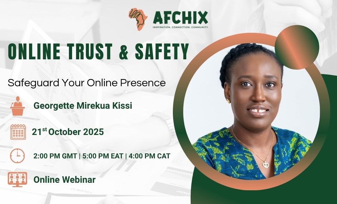 We are excited to invite you to the AfChix Monthly Webinar on Online Trust and Safety, featuring Georgette Mirekua Kissi, Ag. Head of IT Security and Planning at the University of Ghana. This interactive session will take place on Tuesday, 21st October 2025, at 2:00 PM GMT (5:00 PM EAT). The webinar will run virtually via Zoom and will include a live simulation designed to help participants understand and respond to real-world online safety challenges.